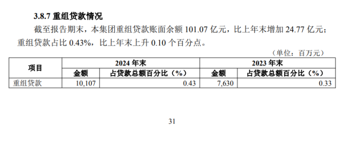 需要指出的是,2024年華夏銀行的重組貸款達到了101億元,較2023年淨增加24.77億元,重組貸款大幅增加,確實能起到降低不良貸款規模、不良率的作用,畢竟一般進行重組的都是不良貸款。