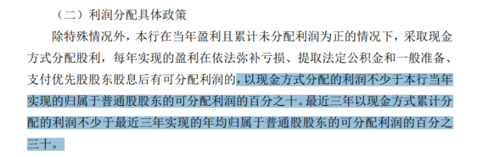 在最新的華夏銀行公司章程版本中,關於利潤分配是這麼規定的:“以現金方式分配的利潤不少於本行當年實現的歸屬於普通股股東的可分配利潤的百分之十。最近三年以現金方式累計分配的利潤不少於最近三年實現的年均歸屬於普通股股東的可分配利潤的百分之三十。”