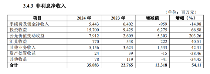 主要是投資收益和公允價值變動收益,投資收益高達157億元,同比增加了66.58%,而公允價值變動收益則激增了203.26%、達79.12億元,淨增加53億元。