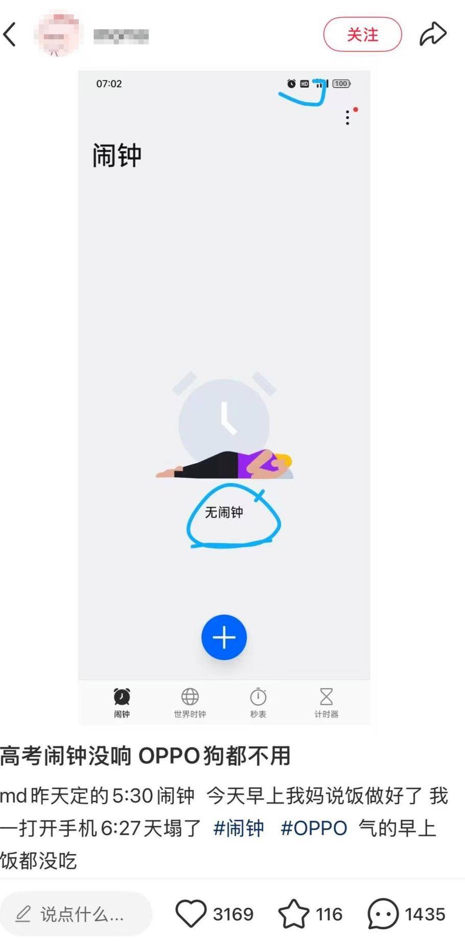 6月7日高考首日,一則“OPPO手機高考鬧鐘未響”的帖子在社交平台引發廣泛關注。博主稱,高考前一晚在OPPO手機上設置了早上5:30的鬧鐘,然而鬧鐘並未按時響起。直到媽媽做好早餐後,她在6:27打開手機才發現鬧鐘未觸發,“氣得早上飯都沒吃”。