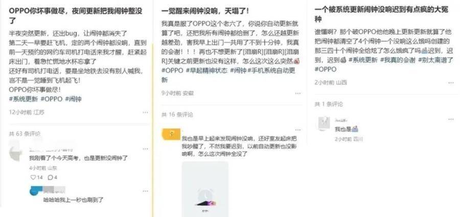 除了這個發帖的考生,當天還有多名網友發帖稱 OPPO手機在系統自動更新後,所有鬧鐘都被刪除,影響了自己的原定計劃。