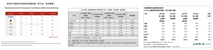 在全球市場方面,Counterpoint、IDC及Canalys三家機構數據均顯示,OPPO在2025年一季度的出貨量出現下滑。具體來看,Counterpoint數據顯示,2025年第一季度,OPPO以2400萬部的出貨量排名第四,但出貨量同比下滑了5%;IDC數據顯示,OPPO在該季度的出貨量為2350萬部,同比下滑6.8%,市場份額也由去年同期的8.4%下降至7.7%;Canalys數據顯示,OPPO在該季度的出貨量為2270萬部,同比下滑9%。值得注意的是,三家機構數據均顯示,OPPO是前五大手機廠商中出貨量唯一下滑的品牌。