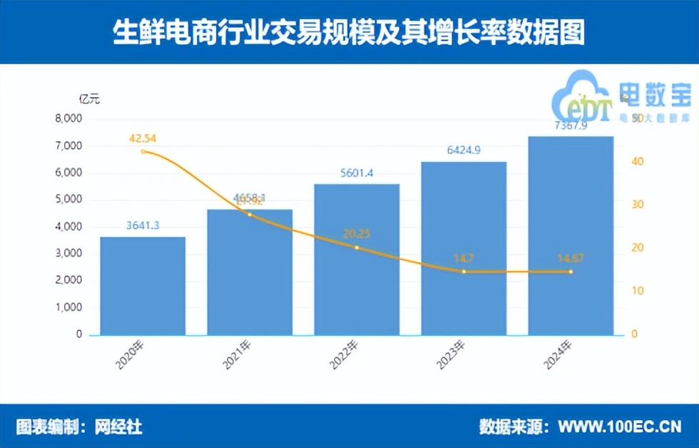 2024年生鮮電商交易規模達到7367.9億元,同比增長14.67%。