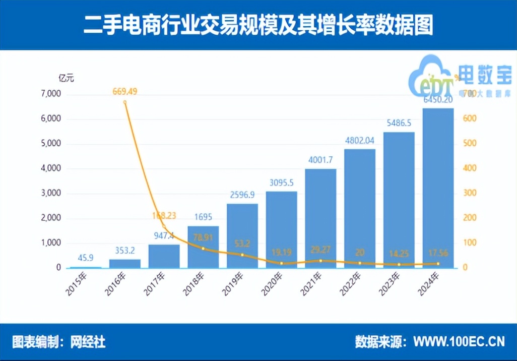 2024年,二手電商交易規模達6450.2億元,同比增長17.56%。此前,2016年增長率高達669.49%,從2017年-2023年交易規模和增速分別為, 947.4億元(168.23%)、1695億元(78.91%)、2596.9億元(53.2%)、3095.5億元(19.19%)、4001.7億元(29.27%)、4802.04億元(20%),5486.5(14.25)。