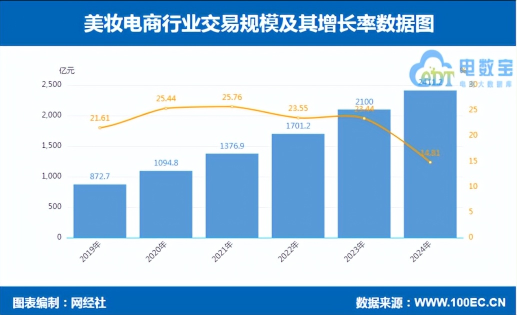 2024年,我國美妝電商市場規模為2411.2億元,同比增長14.81%。主要的玩家包括:綜合平台類:淘寶、京東、拼多多、抖音、快手等;品牌類:逸仙電商、毛戈平、逐本等;代運營類:寶尊電商、麗人麗妝、壹網壹創、悠可等。