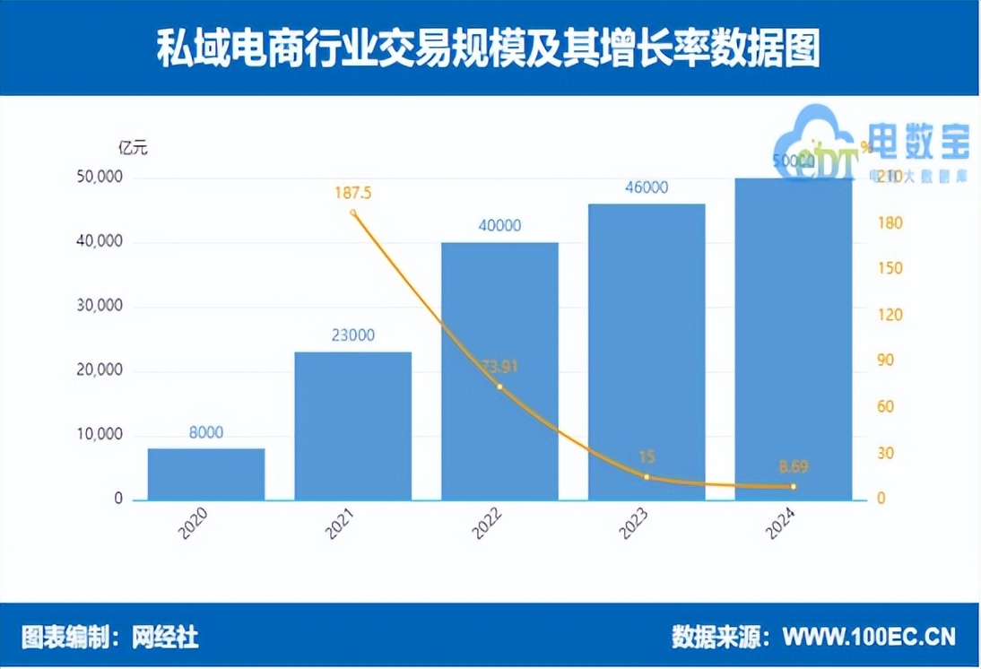 2024年,私域電商交易規模達到5萬億元,同比增長8.69%。2020年至2023年規模(增長率)依次為8000億元、23000億元(187.5%)、40000億元(73.79%)、46000億元(15%)。私域電商活躍度持續增長,市場規模不斷擴大,特別是私域直播迅速崛起。此外,隨着企業對私域流量的重視越來越多的用户被吸引到私域電商平台中。