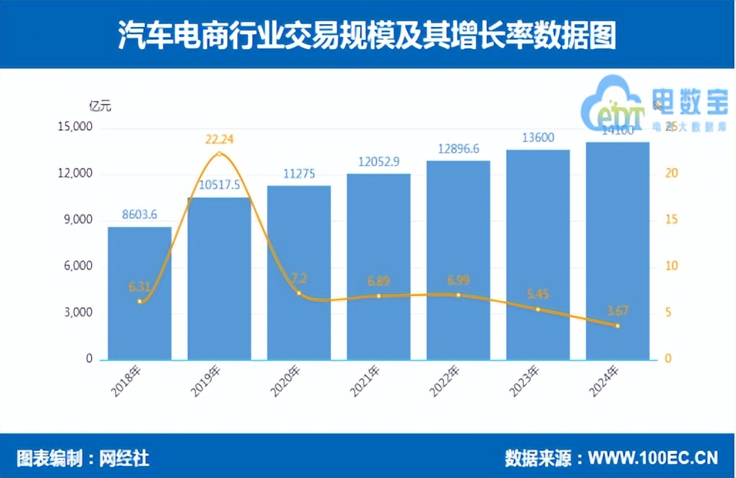 2024年,我國汽車電商市場規模為14100億元,同比增長3.67%。2020年至2023年規模(增長率)依次為:11275億元(7.2%)、12052.9億元(6.89%)、12896.6億元(6.99%)、13600億元(5.45%)。