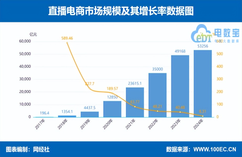 據網經社“電數寶”電商大數據庫顯示,**2024年直播電商交易規模達到53256億元,同比增長8.31%。**2020年至2023年規模(增長率)依次為:12850億元(227.7%)、23615.1億元(83.77%)、35000億元(48.21%)、49168億元(40.48%)。
