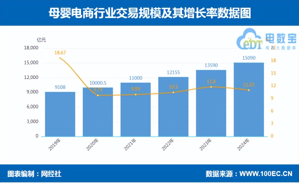 2024年,母嬰電商市場規模為15090億元,同比增長11.03%。從2015年-2023年增速分別為,98.34%、38.9%、27.29%、20.37%、18.67%、9.79%、9.99%、10.5%、11.8%,增速呈現波動狀態。