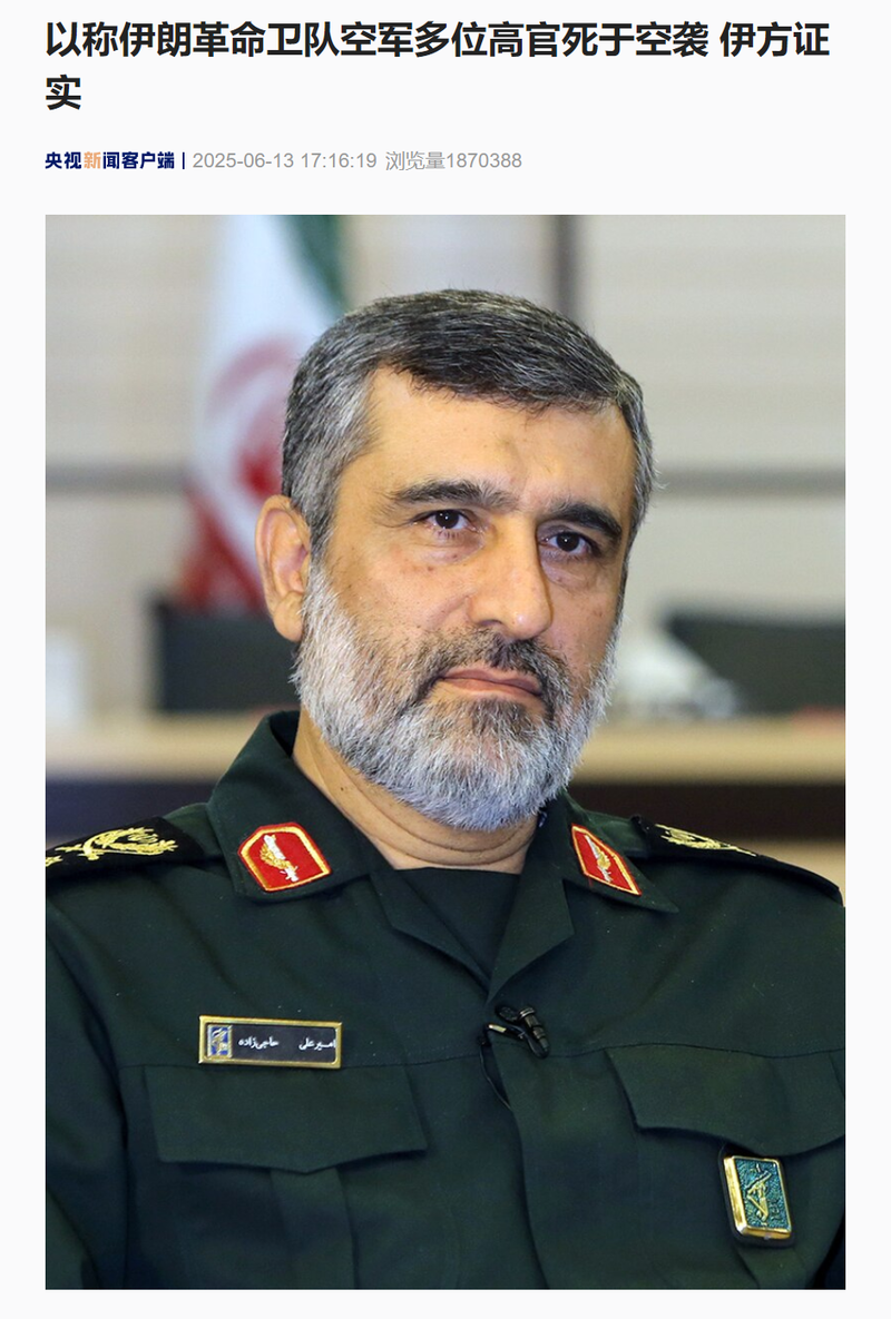 當地時間13日,以色列國防部長辦公室發佈聲明稱,伊朗伊斯蘭革命衞隊空軍的大部分領導層在以色列空襲中被打死。聲明表示,襲擊發生時,這些高層官員正在一個地下指揮中心召開會議。