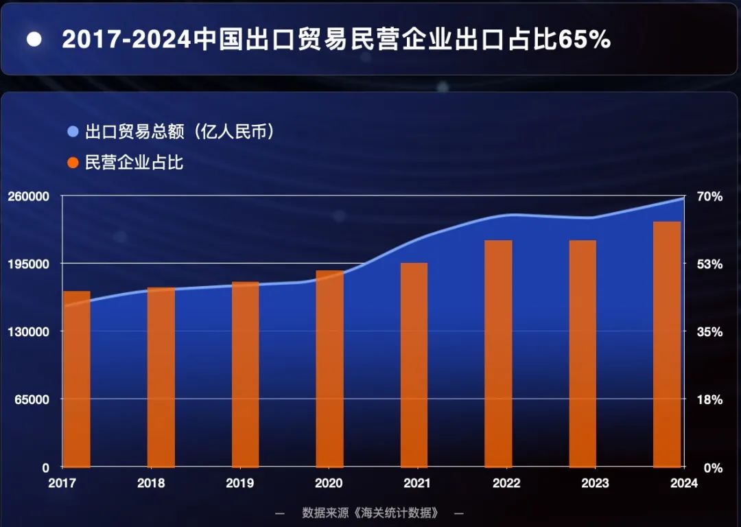 如果我們把時間線也拉長,從1999年開始到2024年,1999年中國民營企業的出口佔比不到2%,今天出口佔比65%,這足以反映過去20年中國經濟的結構性變化。