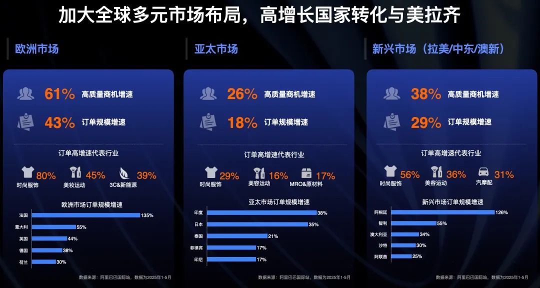 從訂單的角度來講,我們看到非美交易的訂單增長數字在3、4、5月相對來説比較平均,都在30%到40%之間,增速也有所上升,如果看美國3、4、5月訂單,增速從35%降至10%,確實還是受到影響,增速則在放緩。中小企業韌性非常強,但是因為美國關税政策不斷在波動,非常多的海外買家企業會選擇觀望(看關税是否會變化)。