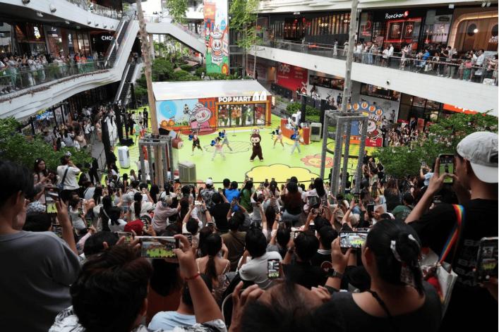 在走向全球的過程中,泡泡瑪特也會充分利用一切可利用的資源進行聯動。比如其在泰國首店開業前一個月,就包下了該購物中心11塊大屏幕進行廣告聯播;還會邀請網紅達人進行打卡和互動,並形成一系列短視頻營銷來保證門店熱度。