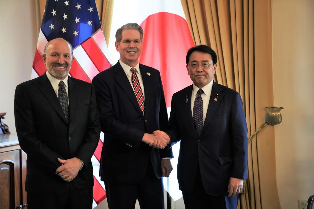 ▲5月31日,日本首席貿易談判代表赤澤亮正(右)與美國財長貝森特和商務部長盧特尼克舉行會晤。