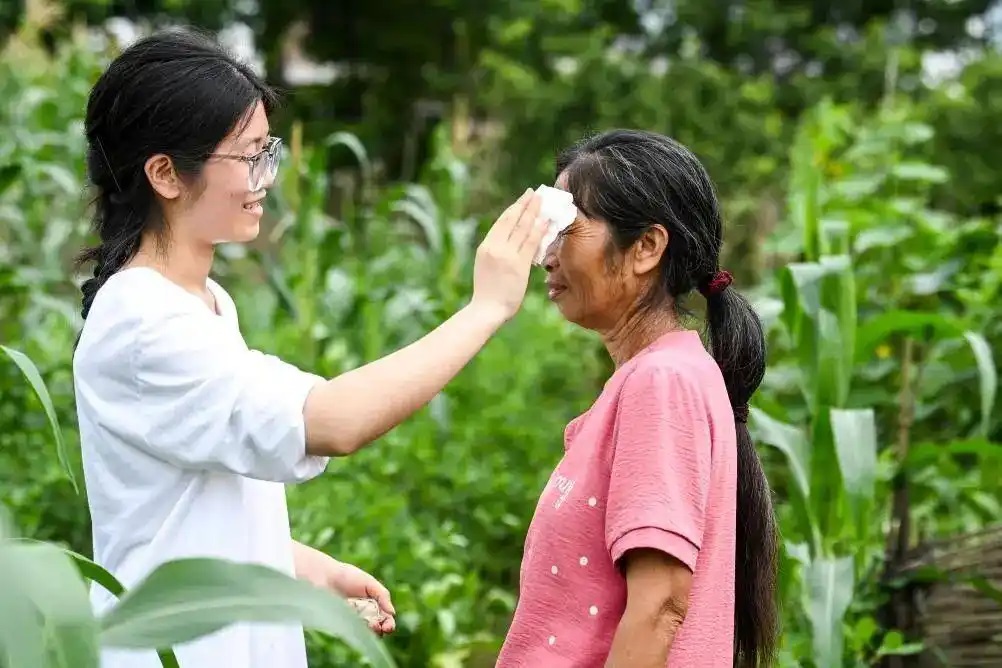 6月13日,劉燕(左)在農忙之餘給媽媽擦汗。