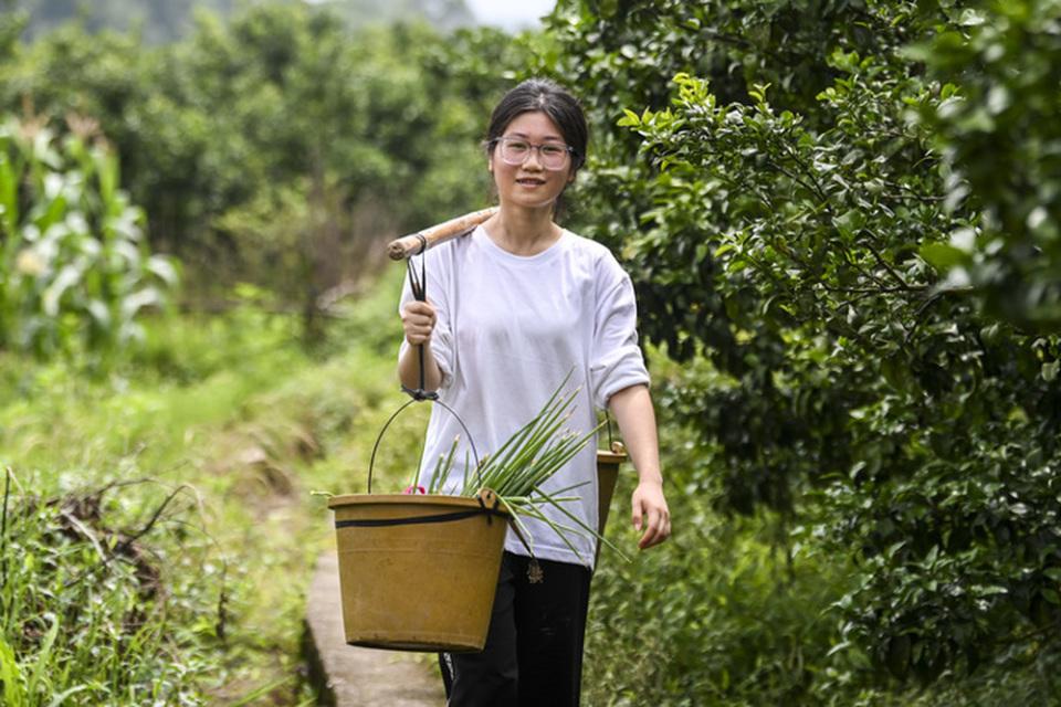 6月13日,劉燕用扁擔挑着從自家菜地採摘的蔬菜,走在回家路上。