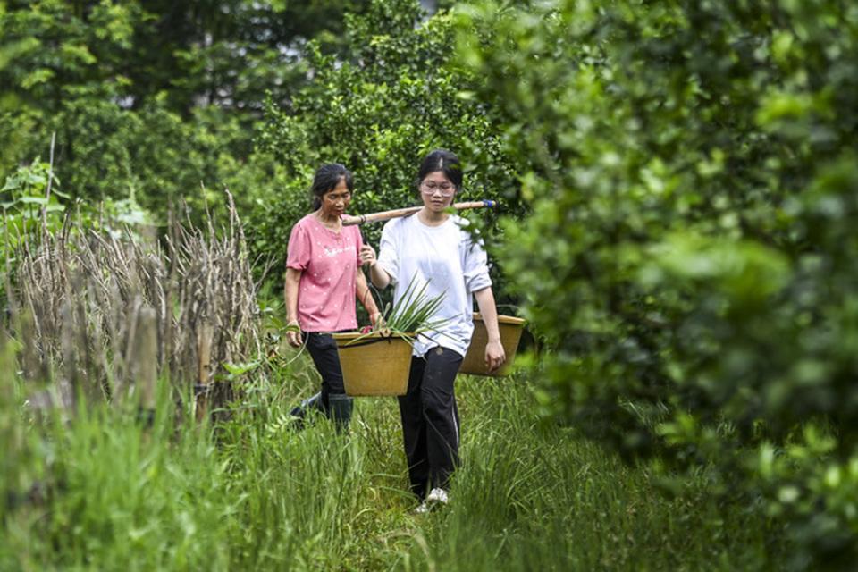 6月13日,在廣西桂林市灌陽縣新街鎮,劉燕(右)與媽媽一起幹完農活回家。