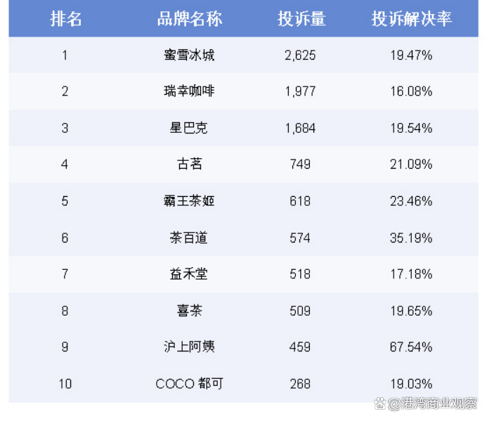 根據消費保等平台數據顯示,投訴量最多的前十家咖啡奶茶品牌中,蜜雪冰城以2625件的投訴量高居榜首,瑞幸咖啡、星巴克分別以1977件、1684件位列第二、第三。