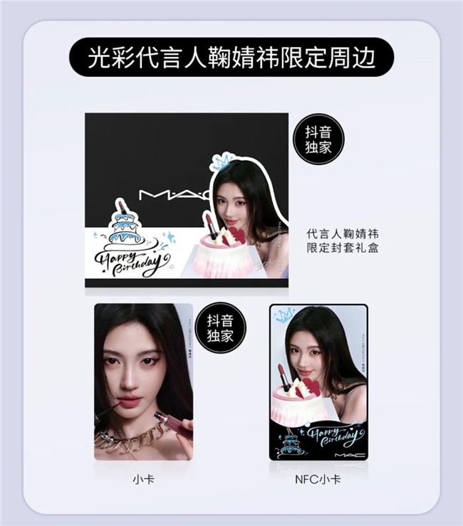 妝容趨勢與直播熱度攀升的同時,抖音商城超級品牌日「美麗的榮耀」與MAC也共同展開了產品機制層面的精巧佈局:除了直播妝容演繹過程中接連亮相的明星單品,直播間還全球首發了MAC兩款反光鏡唇蜜、唇線筆產品,並特別推出附贈有品牌代言人定製小卡片的 「抖音獨家套組禮盒」 ,一次次掀起當場直播間的成交熱潮。