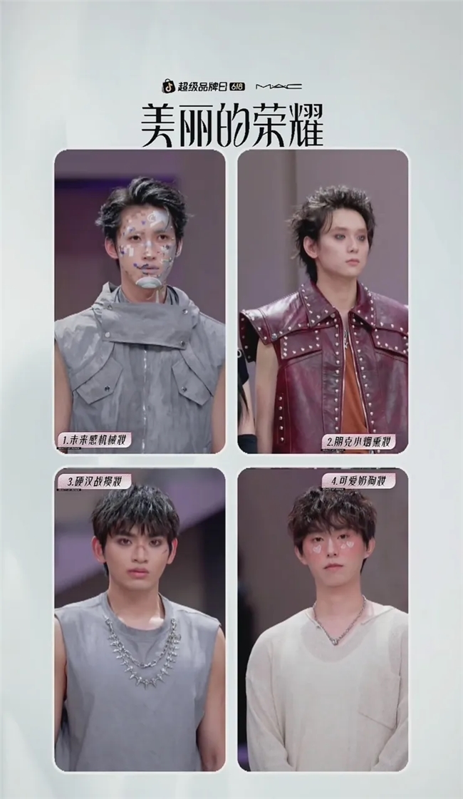 這一環節中,16位頂尖彩妝師圍繞「百變男團」「浪漫約會」「年代妝」「跨風格多元融合」為四大主題展開競技,每位彩妝師在闡述設計思路時自然帶入MAC產品的獨特亮點,比如在打造未來感機械妝時,「SFF粉底液」如液態金屬般持久貼合的妝效,完美模擬了未來人類肌理的冷光釉面;在詮釋朋克小煙燻妝時,「美拉德眼影盤」的層疊暈染,創造出猶如淬火金屬般的漸變虹光;「絕絕紫散粉」彷彿為可愛奶狗妝注入柔焦濾鏡,將夢幻的啞光質感轉化為少年臉上的紅暈。這些細緻的產品妝效,都與彩妝師解説以及直播間商品掛鏈機制相協同,推動了內容、產品與用户購買決策的順暢銜接。