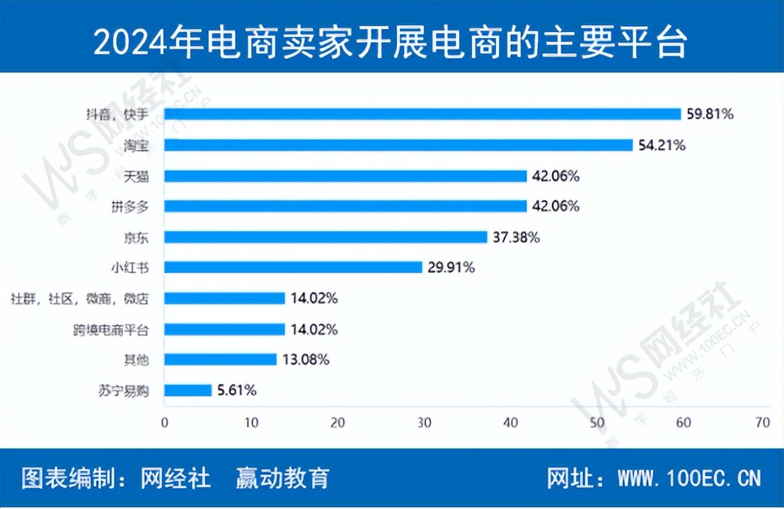 調查數據顯示,企業開展電子商務的主要平台依次為**抖音&快手(59.81%)、淘寶(54.21%)、天貓(42.06%)、拼多多(42.06%)、京東(37.38%)、小紅書(29.91%)、社羣社區微商微店微店(14.02%)、跨境電商平台(14.02%)、其他(13.08%)、蘇寧易購(5.61%)**等。