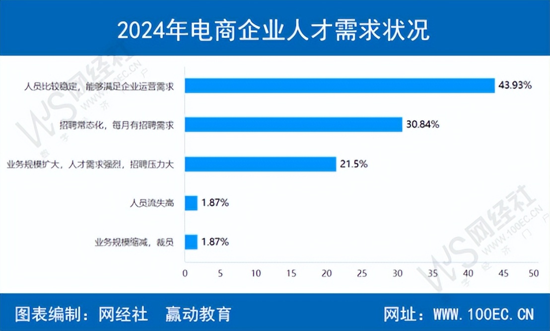 報告顯示,電子商務企業人才需求整體狀況中,人員穩定以及招聘常態化的狀態,佔比達74.77%。業務規模擴大,人才需求旺盛的企業佔比21.5%,比2023年的19%繼續增長。