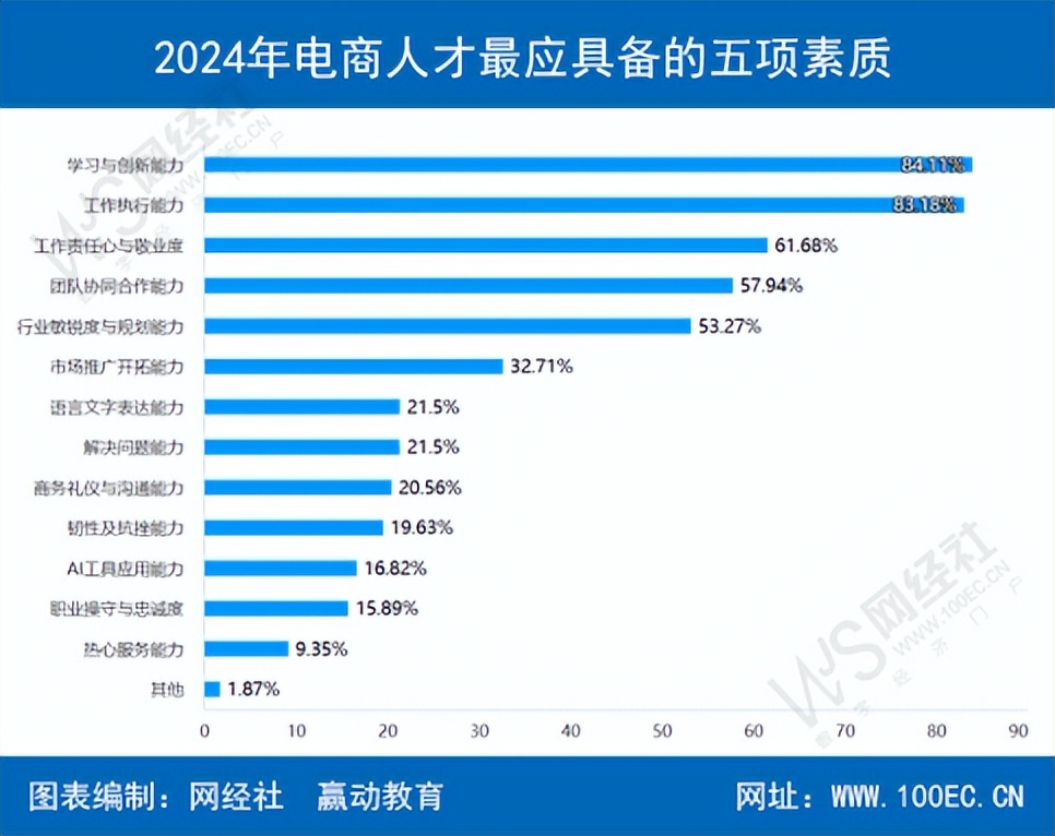 對此,網經社電子商務研究中心特約研究員、贏動教育總裁崔立標表示,電商企業認為電商人才最應具備的素質是學習與創新能力,説明了電商企業作為一個高速發展、快速迭代的數字經濟產業單元對從業者的核心要求。電子商務是商業的網絡化、數據化、智能化,是商業和信息技術的高度融合,對人才素質的要求,學習與創新是第一位的。