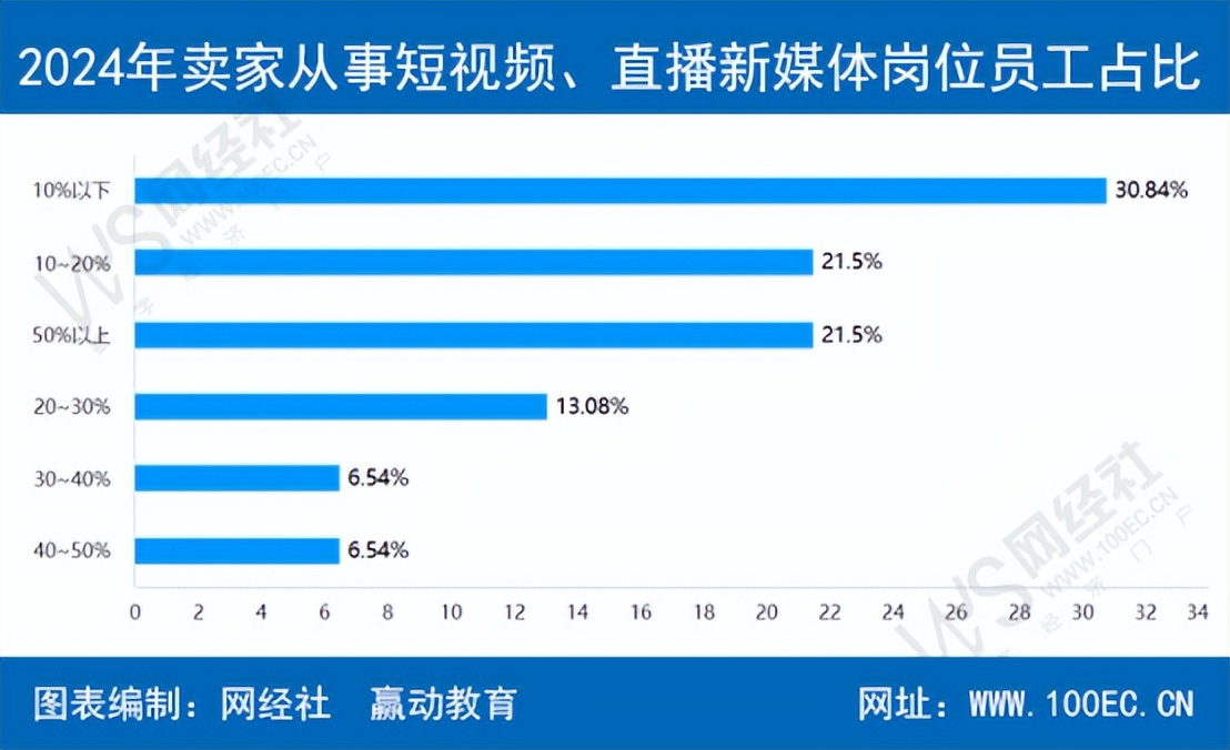 此外,企業2024年電商團隊中從事短視頻,直播等新媒體營銷工作的員工,人數超過50%的企業從去年的15%增長到今年的21.5%,員工佔比低於10%的企業從去年36%,下降到今年的30.84%。