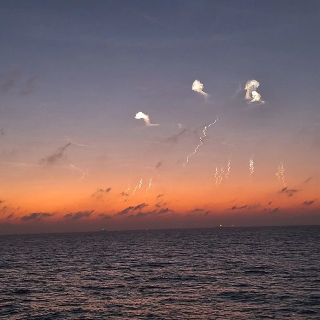 由於此時太陽已經在地平線上,高空已經被陽光照亮,不少以色列民眾拍攝了伊朗彈道導彈身披朝霞劃破長空,美軍的THAAD(薩德)系統,以色列的“箭-2/3”反導攔截系統對伊朗的彈道導彈組織攔截的壯觀景象。