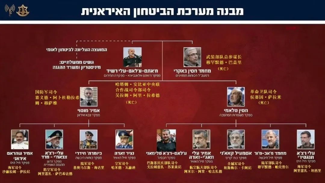 2025年6月13日夜間,以色列空軍大舉出動,給伊朗造成重大損失。伊朗武裝部隊總參謀長穆罕默德·巴蓋裏少將,伊朗革命衞隊司令侯賽因·薩拉米少將,伊朗革命衞隊聯合作戰司令部司令吾拉木·拉希德少將,伊朗革命衞隊空天部隊司令阿米爾·哈吉扎德准將、防空部隊司令達沃德·謝赫揚准將、無人機系統司令塔赫爾·普爾准將、伊朗原子能機構負責人達瓦尼博士、安扎德大學校長德黑蘭奇博士先後身亡。
