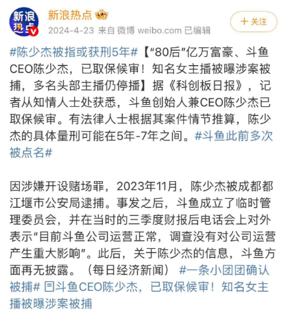 上次鬥魚火出圈,還是 2023 年 11 月,“ 鬥魚證實 CEO 陳少傑失聯” 衝上熱搜。