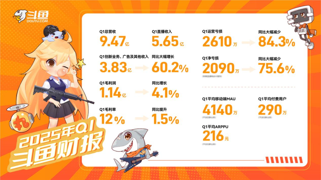 5 月 20 日,鬥魚發佈 2025 年第一季度財報,運營虧損為 2610 萬元,同比大幅減少 84.3 %;調整後淨虧損為 2090 萬元,同比縮窄 75.6%,可以看到,虧損在快速收窄。