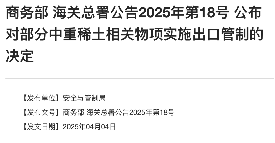 按照海關總署公告2025年第18號公告中《對部分中重稀土相關物項實施出口管制的決定》顯示,新一輪稀土出口管制除了明確釤、釓、鋱、鏑、鑥、鈧、釔七類稀土品類的出口管制之外,還提及出口經營者應遵從相關的審批以及物項識別機制,這其中或許就涉及已經在近期上線的稀土追蹤溯源系統。