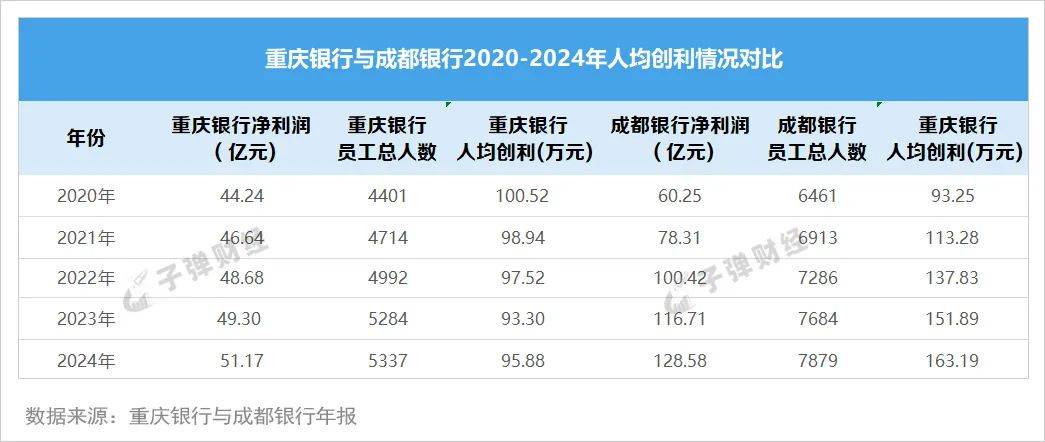 仍不容忽視的是,與重慶銀行並稱為“西部雙子星”的成都銀行,近年來在人均創利方面已反超重慶銀行。