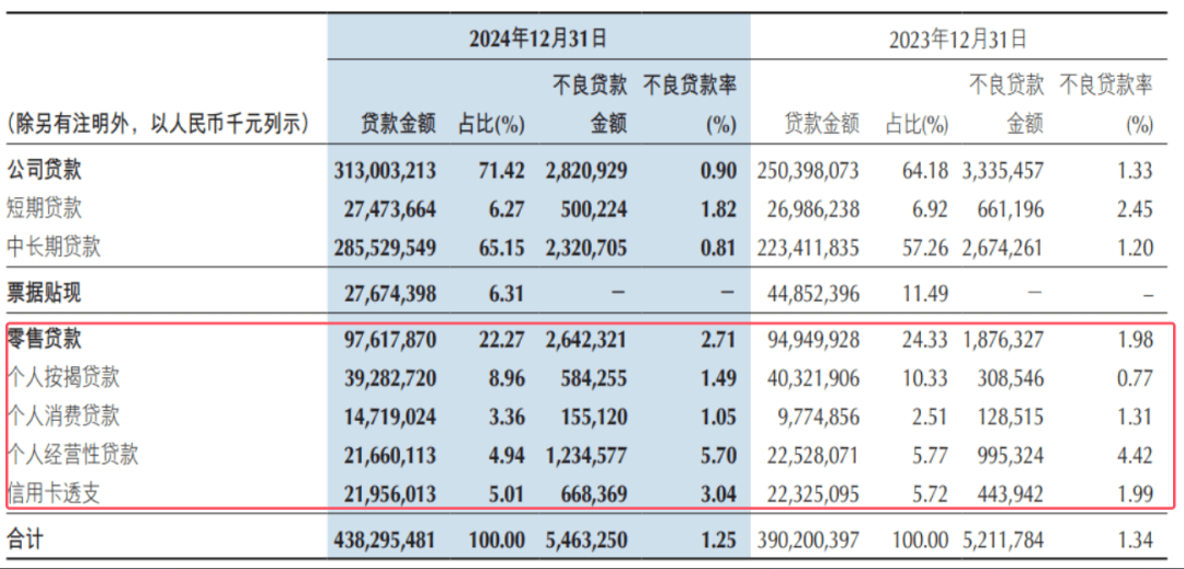 值得注意的是,2024年末該行零售貸款不良率為2.71%,其中個人按揭貸款、個人經營性貸款、信用卡透支的不良貸款率分別為1.49%、5.7%、3.04%。由此可見,零售端的信貸資產質量問題是拖累該行盈利增長的主因之一。