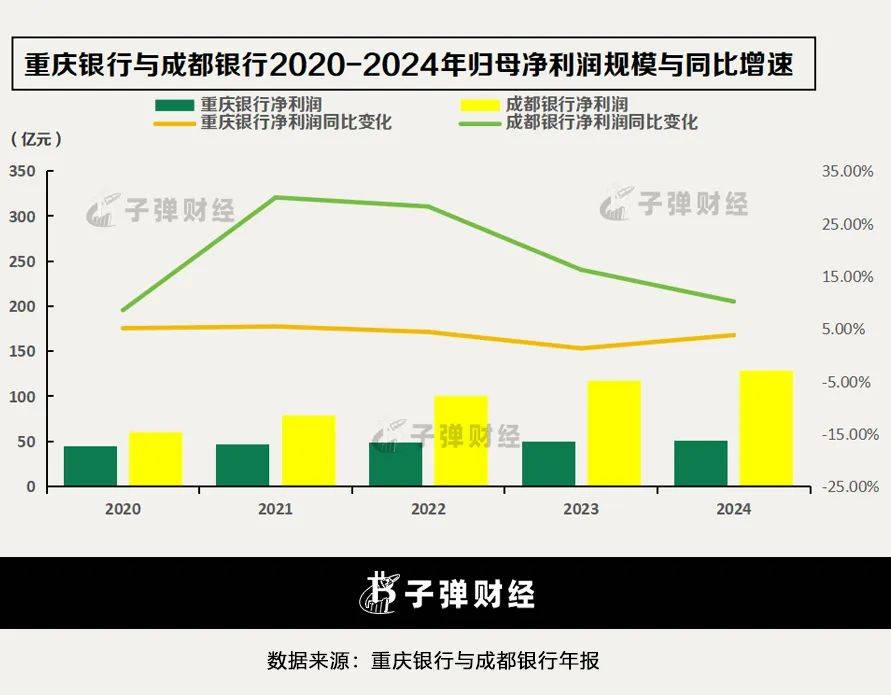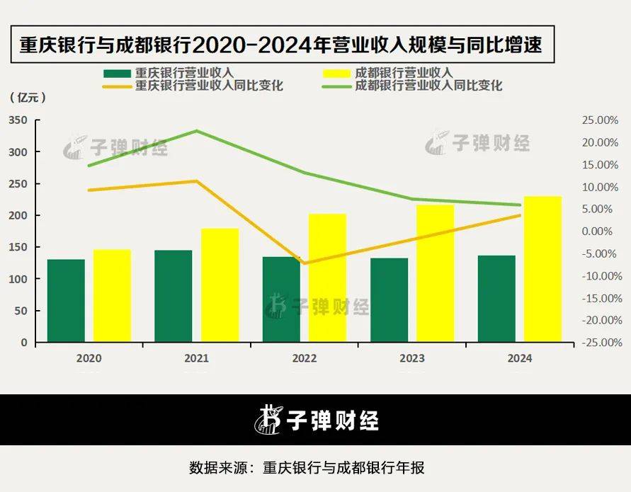 具體而言,過去五年(2020年至2024年,下同)重慶銀行的營業收入和淨利潤始終低於成都銀行,並且自2022年之後,兩家銀行的差距逐漸拉大。