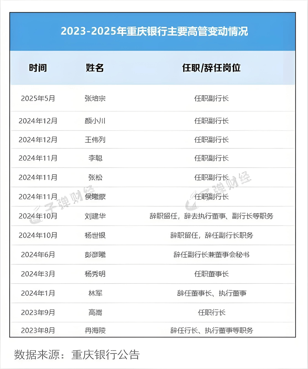 2024年,重慶銀行高管團隊進行了大調整。其中,1月,林軍辭任董事長,3月由農業銀行重慶市分行原黨委副書記、原副行長楊秀明空降接任。此後,3名副行長接連辭任,11月至12月又同時新任命了侯曦蒙、李聰、張松、顏小川、王偉列等5位副行長。
