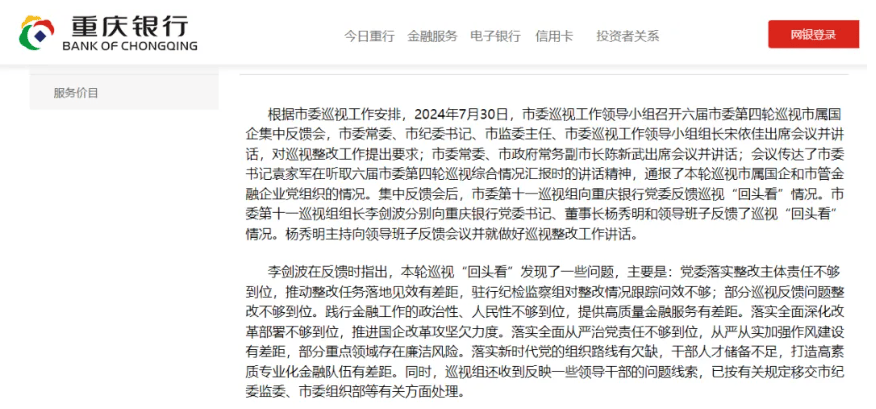 2024年7月,重慶市委巡視組向重慶銀行黨委反饋巡視“回頭看”情況,提出該行幹部人才儲備不足,打造高素質專業化金融隊伍有差距等問題。
