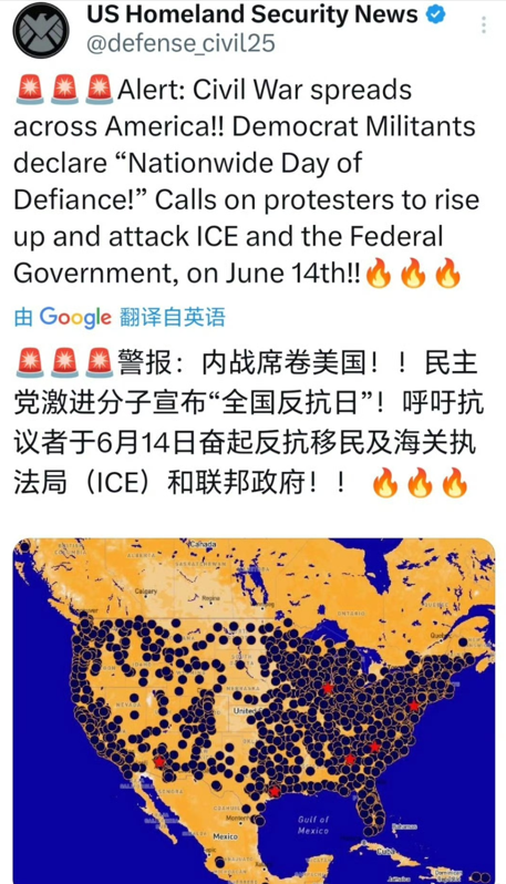 現在圍繞驅逐非法移民導致的洛杉磯的騷亂遠沒有停息的跡象,反而更多的城市反而開始了新的騷亂。民主黨激進分子又宣佈6月14日為“全國反抗日”,呼籲抗議者於6月14日奮起反抗移民及海關執法局(ICE)和聯邦政府!!