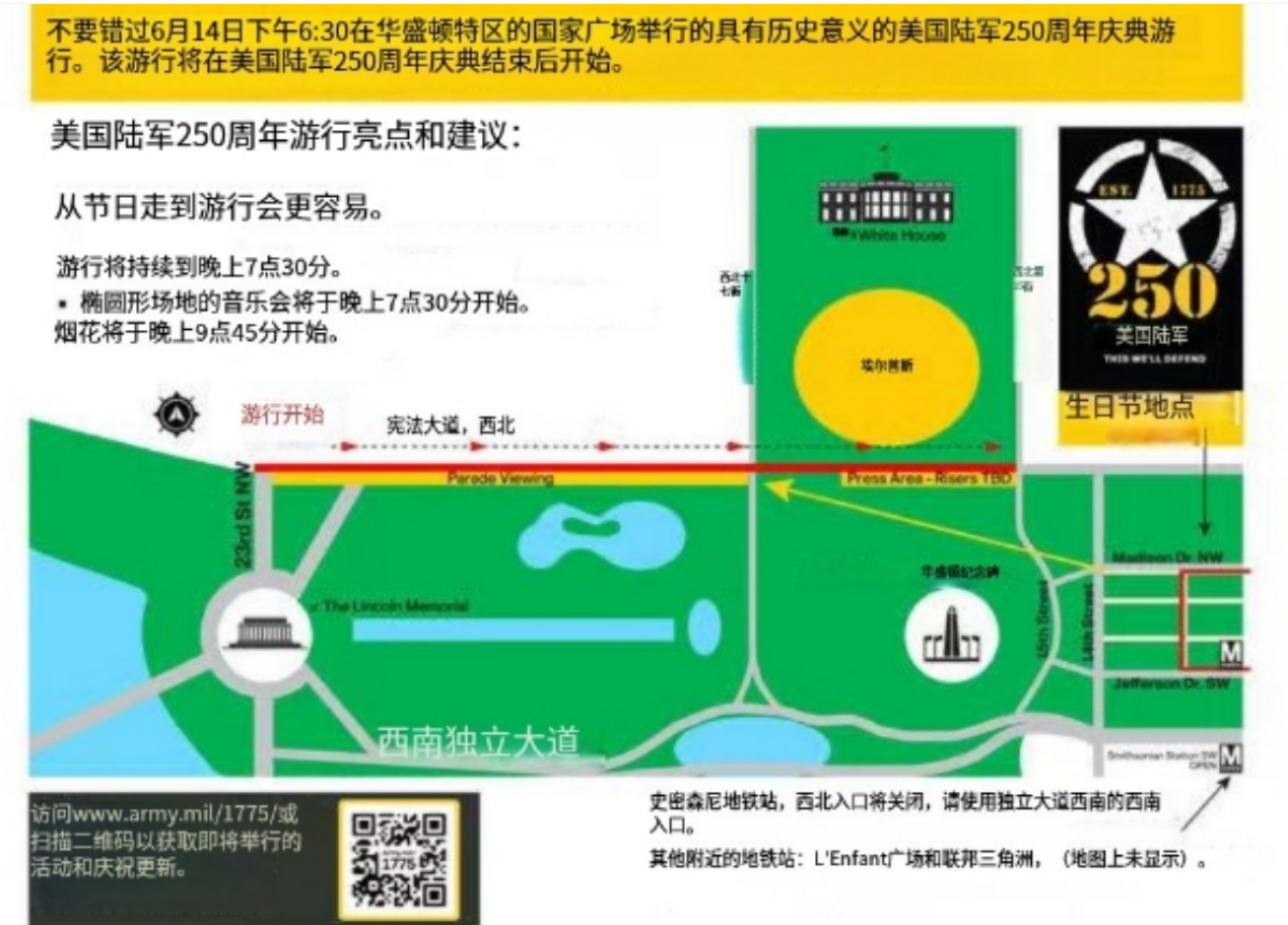 6月14日下午6:30在美國華盛頓特區的國家廣場將舉行具有歷史意義的美國陸軍250週年慶典遊行,這一天也是美國總統特朗普的生日。