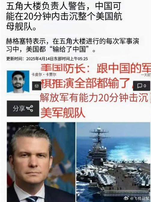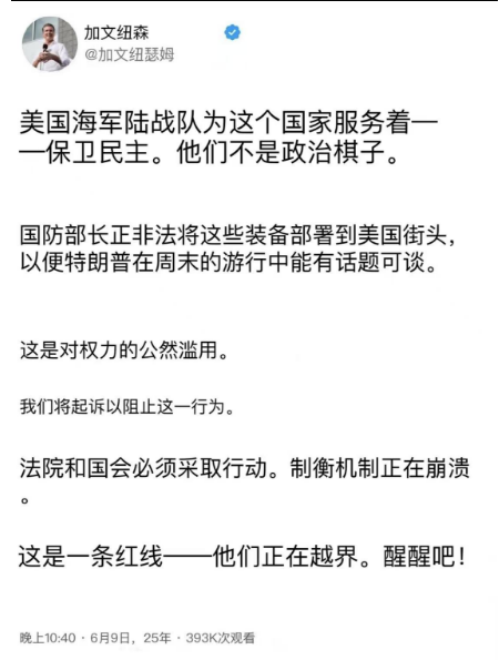 美國國防部長表示在五角大樓進行的每次軍事演習中,美國都“輸給了中國”,中國可能在20分鐘內擊沉整個美國航母艦隊。這麼重要的機密美國國防部長公開,也真的讓美國五角大樓臉上無光。佩洛西在加州的講話稱,“美國在加州的行動加劇了緊張局勢,特朗普要逮捕現任州長是走向暴政的標誌。” 加州州長表示法院和國會必須採取行動。制衡機制正在崩潰,這是一條紅線--他們正在越界。
