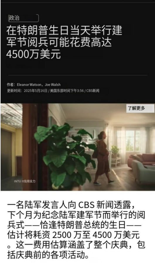 美軍發言人向CBS新聞透露,6月大閲兵預計耗資2500萬至4500萬美元,成本估算涵蓋整個慶祝活動,包括閲兵前的相關活動。