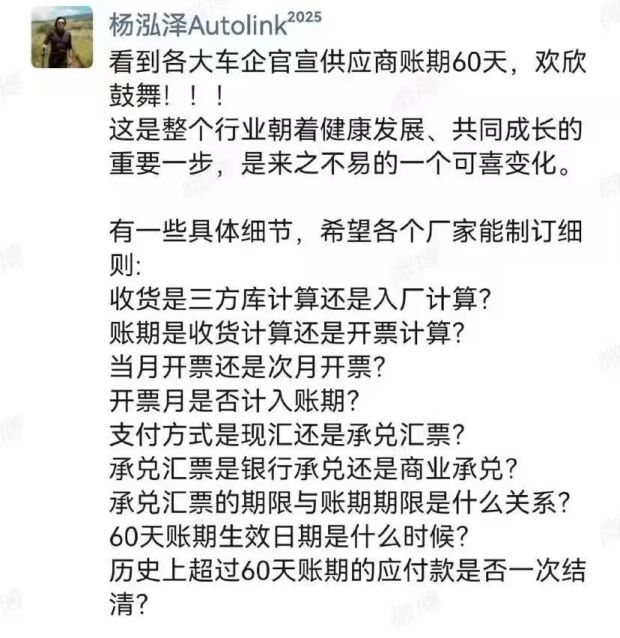 多家車企承諾縮短賬期後,車聯天下董事長楊泓澤在朋友圈發出連串問題,希望車企能制訂具體細則: