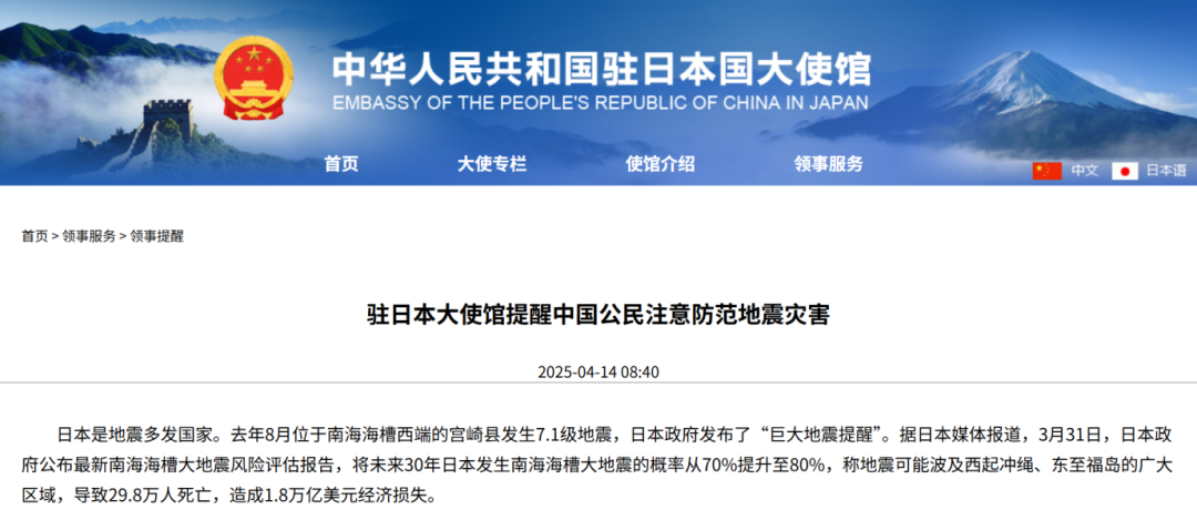 4月中旬,中國駐日本大使館的網站上發佈消息,提醒大家注意防範地震災害。消息中提到,日本政府在3月31日公佈一份報告,指出未來30年內南海海槽大地震的發生概率從70%提升到了80%。