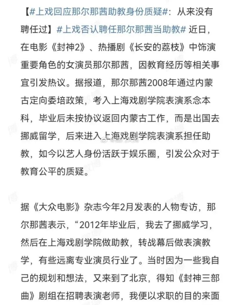 另據《大眾電影》雜誌今年2月發表的人物專訪,那爾那茜表示,“2012年畢業後,我去了挪威學習,然後在上海戲劇學院做助教,轉戰幕後做表演教學,有些遠離專業演員行業了。當時因為一些我自己的規劃和想法,又來到了北京,得知《封神三部曲》劇組在招聘表演老師,我便以求職的目的來面試了。”