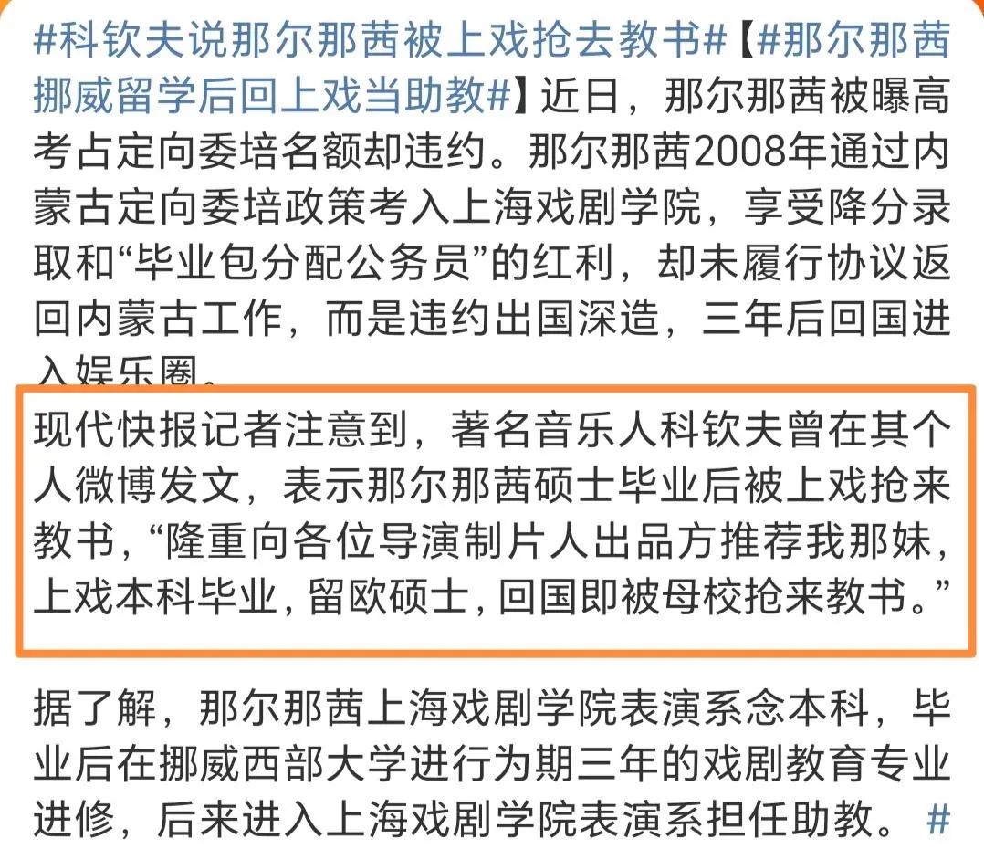 著名音樂人科欽夫曾在其個人微博發文,表示那爾那茜碩士畢業後被上戲搶來教書,“隆重向各位導演製片人出品方推薦我那妹,上戲本科畢業,留歐碩士,回國即被母校搶來教書。”