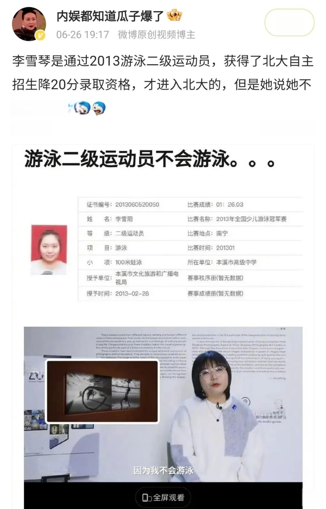 李雪琴曾在訪談中提及憑藉游泳二級運動員身份獲得高考加分,卻被網友質疑其游泳能力;