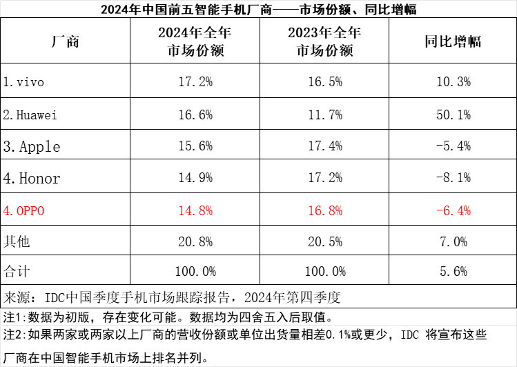 IDC數據顯示,2023年,榮耀市場份額為17.2%,OPPO為16.8%,兩者分列第四、第五。而到了2024年,兩者的全年市場份額分別為14.9%與14.8%,差距只有0.1%,IDC直接將兩者並列為第四。