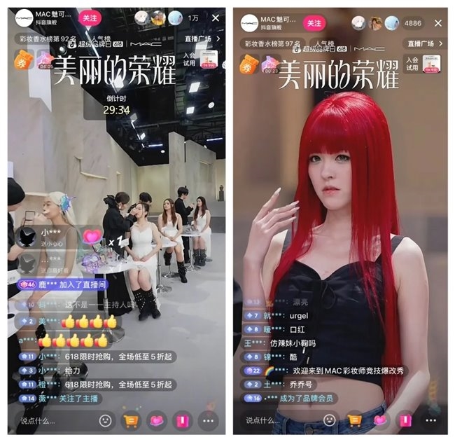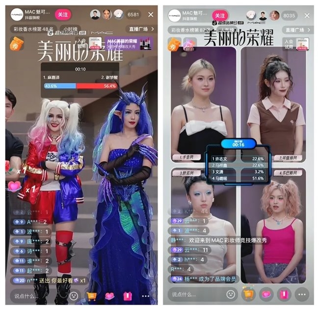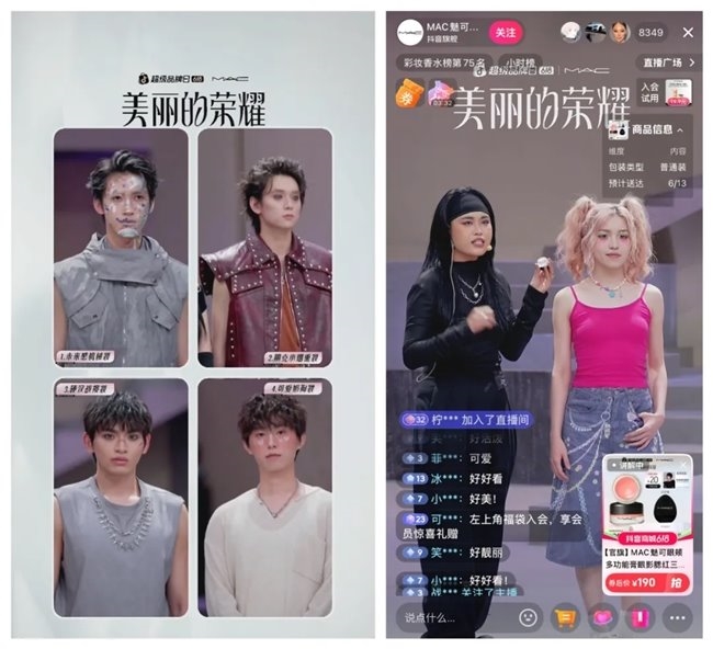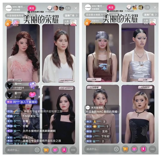 細看才知道,這別出心裁的直播形式,原來是抖音商城超級品牌日的美妝垂類IP**“美麗的榮耀”**。首期,抖音商城超級品牌日和美妝品牌M·A·C魅可(MAC)合作,一起打造了本次彩妝師競技爆改秀。