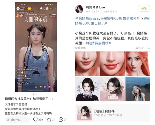 官宣視頻才一發出,粉絲已經發現了亮點:鞠婧禕粉絲名叫“蜜橘”,這個妝叫“蜜橘妝”,妝上就寫着粉絲的名字。這是什麼品牌助力愛豆與粉絲的雙向奔赴。